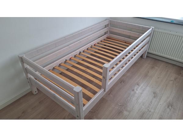 Stevig 1 persoonsbed van Flexa. Hout met white wash laklaag. De laklaag is her en der wat beschadigd. En op de laatste foto is een scheurtje bij de schroefgaten. Deze gaten worden niet gebruikt bij deze versie vh bed, dus maakt het niet uit.