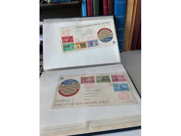 In prima staat 11 albums met enveloppes van 1ste dag uitgiftes van voornamelijk allerlei sporten uit allerlei landen.