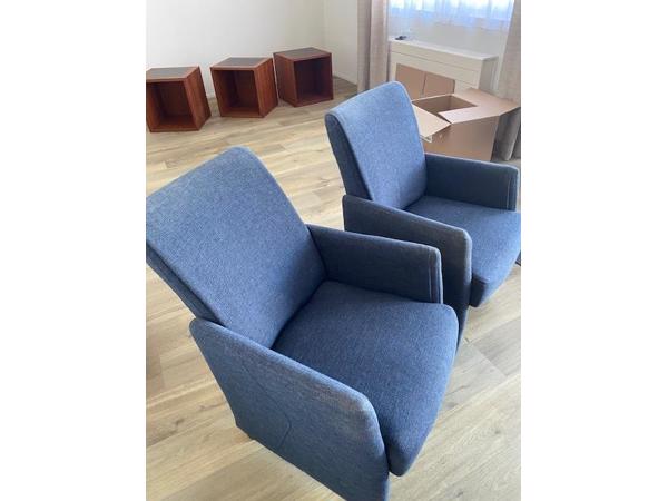 Twee comfortabele blauwe fauteuils. Ze zijn gebruikt, maar in goede staat. Ideaal voor in de woonkamer of studeerkamer. Breedte tussen 50 en 75 cm. Diepte minder dan 75 cm. Materiaal: Stof. Verstelbare leuning