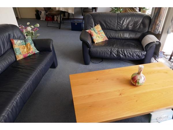 3. 2 en 3-zitsbank donkerblauw leder en salontafel massief beukenhout