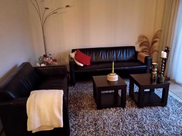 Mijn schoonmoeder biedt haar zithoek aan. Bevat twee zwarte banken, 2 zwarte eiken bijzettafels en een grijs hoogpolig tapijt. Bak bevat wat gebruikerssporen maar zit verder nog prima. Komt uit een rook- en huisdiervrij huis.