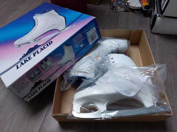 2 paar zwarte kunststof ijshockey schaatsen maat 43 en 1 paar witte kunststof kunstrijschaatsen maat 40.