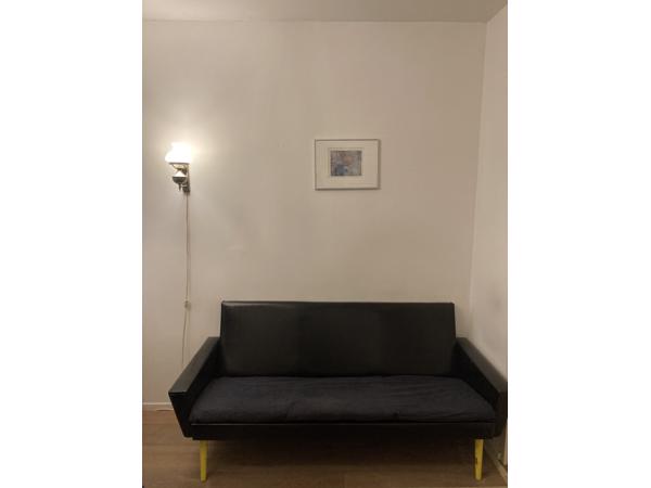 Na er vele jaren met plezier gebruik van te hebben gemaakt, hoop ik iemand anders blij te kunnen maken met deze stijlvolle bank. Door het slanke ontwerp perfect voor kleine ruimtes. De bank is op meerdere plekken licht beschadigd en op één plek is de vering kapot. Die plek is nu gestut met karton (zie foto), maar er kan nog prima op gezeten worden. De zitkussens zijn naar believe te bekleden, zelf heb ik er altijd een doek opgelegd. De houten pootjes kunnen eventueel ook geverfd worden.