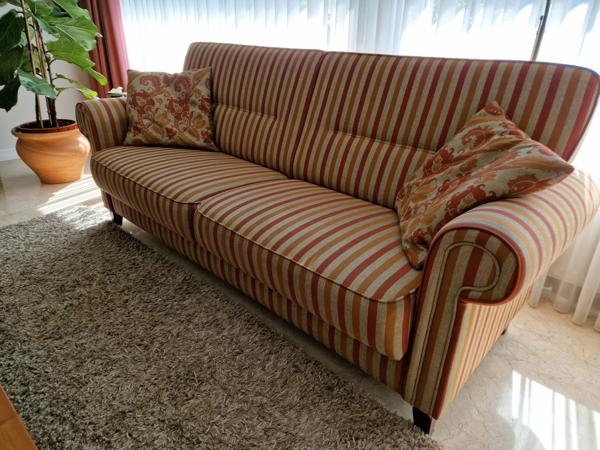 Klassiek gestoffeerde bank en bijpassende fauteuil.