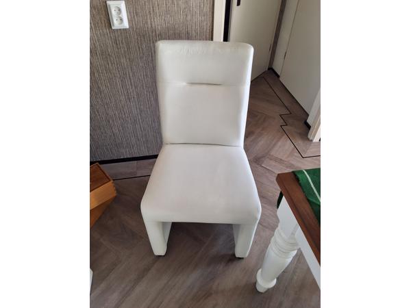 4 mooie eetkamerstoelen op wieltjes (kleur wit) , bekleding iets beschadigd maar met een stoelhoes heb je perfecte eetkamerstoelen naar eigen interieur in te passen.