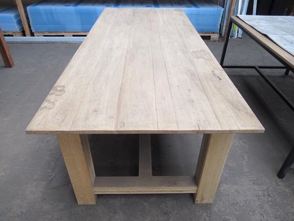 FOTO 3 en 4 Strakke hardhouten tafel gelakt. Afmetingen: Breedte: 90 cm Lengte: 250 cm Hoogte: 85 cm Prijs: € 300,00 excl. btw.