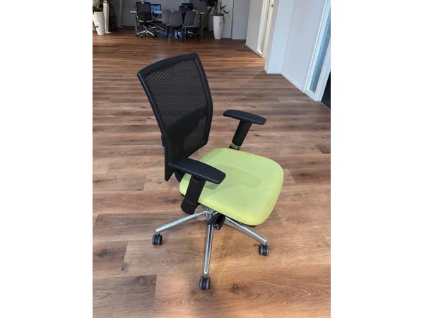 Comfortabele en ergonomische bureaustoel met een frisse groen zitting en een ademende zwarte mesh rugleuning. Ideaal voor lange werkdagen. De stoel is in gebruikte staat, maar functioneert nog uitstekend. Voorzien van wieltjes voor gemakkelijke verplaatsing en verstelbare armleuningen. 4 stuks
