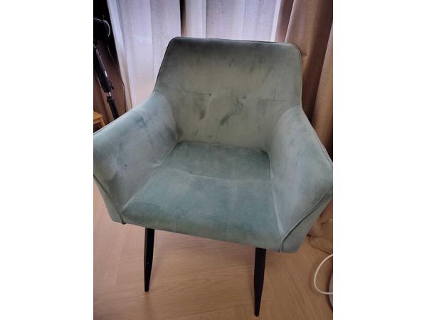 De stof heeft een velours/suède-achtige uitstraling waardoor je op de foto soms donkere plekken ziet; dat komt door het materiaal en de lichtinval. Alle stoelen hebben een egale kleur.