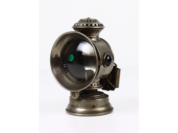 Dit is een antieke metalen lantaarn, gemaakt door de Sterling Manufacturing Co. in New York. Dit soort lampen werd vaak gebruikt op fietsen of voertuigen in het begin van de 20e eeuw en functioneerde met kaarslicht, olie, of gas. De gekleurde lenzen (groen en rood) werden gebruikt om zichtbaar te zijn of voor signalering.
