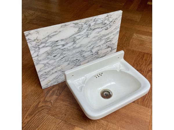 Antieke wastafel met bijbehorende marmeren plaat. Afmetingen Wastafel (BxD): 38 cm x 28 cm. Afmetingen Marmeren Plaat (HxBxD): 40 cm x 56 cm x 1,8 cm. In de marmeren plaat zitten boorgaten waarmee de wastafel bevestigd was.