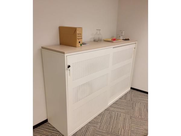 Kast met roldeuren, komt oorspronkelijk van een kantoor. 201x50x122 cm (LxBxH) Heeft vanbinnen planken die versteld kunnen worden. Deur is iets ingedeukt bij vorige verhuizing, zie tweede foto. Let op: kast is vrij zwaar, dus een om deze te verhuizen zou ik een plateauwagentje meenemen.
