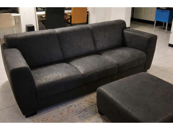 Donkergrijze bank met bijbehorende hocker. Gaat weg i.v.m. aanschaf nieuwe bank.