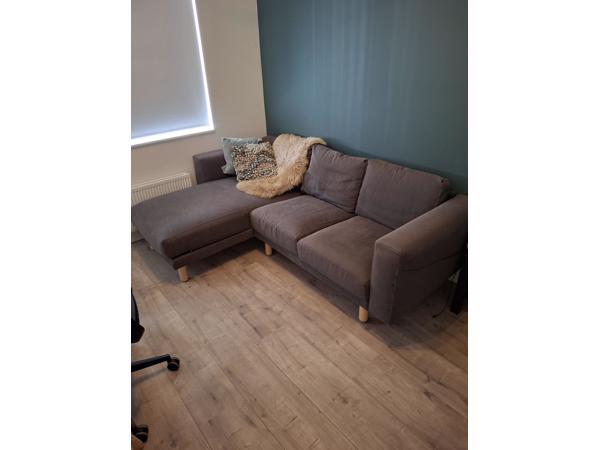 Grijze bank, 2-delig, moag weg ivm herinrichting kamer. inclusief kussens en kleed. Ikea, type bank onbekend.