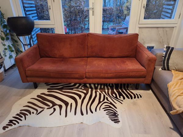 Fijne gezellige chillbank, kan nog prima een ronde mee. 3 zits bank. Zwarte ronde poten. Breedte is 2.10. Zitdiepte 0.97 Mooie roestkleur in ribstof. Achterkant heeft een wit vlekje. Zie fotos.