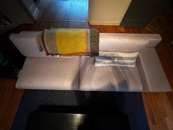 De bank is losgehaald van een hoekbank en heeft aan een kant een open einde. Wij hebben daar een tafeltje staan, dit ziet er prima uit. Bank is nog in hele goede staat. Kleur beige/licht taupe-grijze