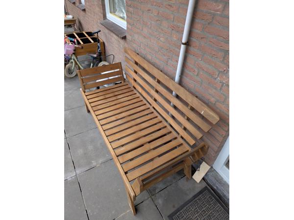 Bankje in prima staat, zonder kussens. Zijde leuningen kunnen plat zodat je kan liggen. Ideaal voor op een balustrade of in de tuin.