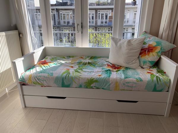 Bedombouw 90x200 mét lade voor extra matras; WIT. Geschikt voor lattenbodem of spiraalbodem maar wordt ZONDER geleverd. Extra schroef in zijkant (zie foto) en bodem van lade is wat los aan de zijkant maar is verder prima. Wat gebruiksschade. Bed op te halen in delen en zelf thuis weer in elkaar zetten. In kader van hergebruik geven we het graag door!