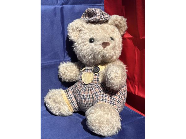 Een naar links kijkende beer met ruwe vacht en een tuinbroek en pet in ruitmotief .