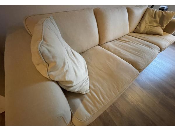 Grote beige bank, je hebt hiervoor wel een aanhanger nodig.