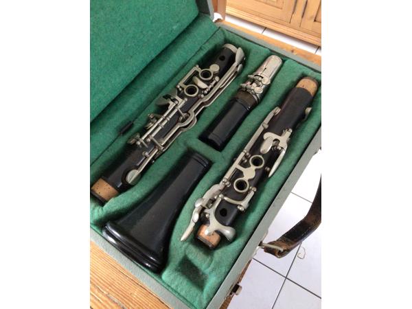 Klarinet is al zeker veertig jaar niet gebruikt. Beker is blijkbaar ooit gevallen, want die is gelijmd. Zit wel in het originele koffertje.Leuk vintage object.