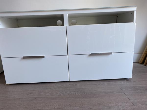 Deze Ladenkasstje van de Ikea is perfect als tv meubel. De vier ruime laden zijn mega handig voor het opbergen van allerlei dingen, en het kleine plankje onder de bovenkant is perfect voor dvd spelers oid, met twee gaten om kabels doorheen te trekken. Op de bovenkant zit een glasplaat.