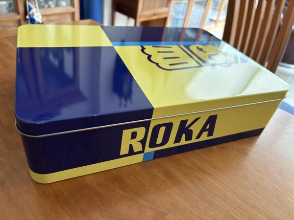 Blik Roka groot blik rechthoekig blauw geel bakker