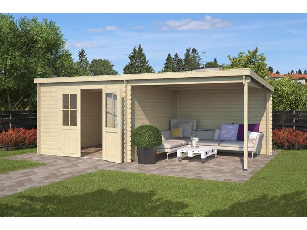 Deze blokhut met overkapping is voorzien van een schuin aflopend dak met de afwatering aan de achterzijde. Dit type blokhut met overkapping kan gespiegeld worden opgebouwd. In dat geval wordt het overkapte deel aan de linkerkant geplaatst en het dichte gedeelte rechts. De latten voor de 4-vlaks raamverdeling op de ruit in de deur worden los meegeleverd.