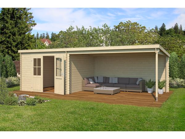Deze blokhut met overkapping is voorzien van een schuin aflopend dak met de afwatering aan de achterzijde. Dit type blokhut met overkapping kan gespiegeld worden opgebouwd. In dat geval wordt het overkapte deel aan de linkerkant geplaatst en het dichte gedeelte rechts. De latten voor de 4-vlaks raamverdeling op de ruit in de deur worden los meegeleverd.