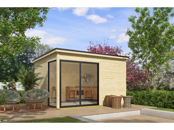 Dit modern vormgegeven Tuinhuis Olivia heeft een fundamentmaat van 385cm(b) x 295cm(d). De 28mm dikke vurenhouten wanddelen zijn uitgevoerd met mes en groef. De stapelbouw methode in combinatie met hoekpalen en schroefsysteem zorgt voor een zeer sterke constructie. Dit mooie design tuinhuis wordt geleverd inclusief een aluminium schuifpui in de voorwand waarvan beide panelen schuivend zijn en het linker paneel afsluitbaar is met een sleutel. In de linkerzijde wordt een vast aluminium glaspaneel gemonteerd. De aluminium delen zijn mat antracietgrijs van kleur en de panelen zijn voorzien van enkelglas. Dit tuinhuis is door de enorme lichtinval ook geschikt als tuinkamer, atelier of als tuinkantoor. U kunt dit tuinhuis ook in spiegelbeeld monteren. Het basispakket wordt geleverd inclusief montagehandleiding, onderdelenlijst en uiteraard alle benodigde bevestigingsmaterialen. Dit Tuinhuis wordt zonder dakbedekking geleverd, hiervoor is optioneel een EPDM dakbedekking pakket bestelbaar. Dit stapelbouwbouw systeem is door een handige doe-het-zelver goed zelf te monteren, je moet wel even met z'n tweeën zijn. Dit tuinhuis wordt als bouwpakket bij u thuis geleverd.