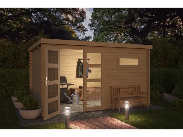 De Blokhut Timian 380x230 Onbehandeld vuren van Outdoor Life Products is een prachtige blokhut met een eigentijdse look. Achter de afsluitbare dubbele deur met lage dorpel is bergruimte voor waardevolle spullen en/of tuingereedschap.