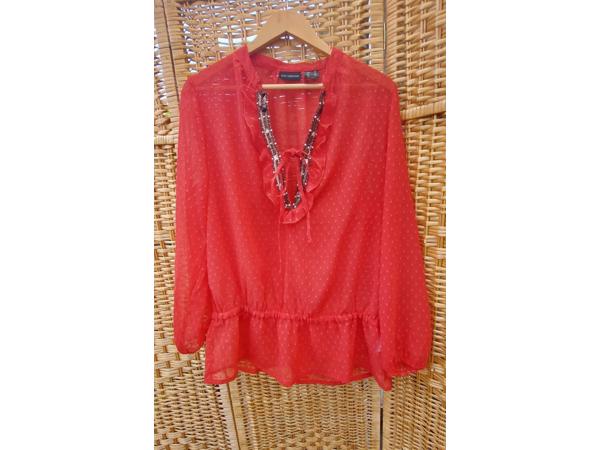 V-451 Rode blouse van Amy Vermont Dunne doorzichtige stof Sluit voor met een lintje Rond de halsopening zitten kraaltjes In de mouwenopeningen en in de taille zit elastiek Is in nieuwstaat