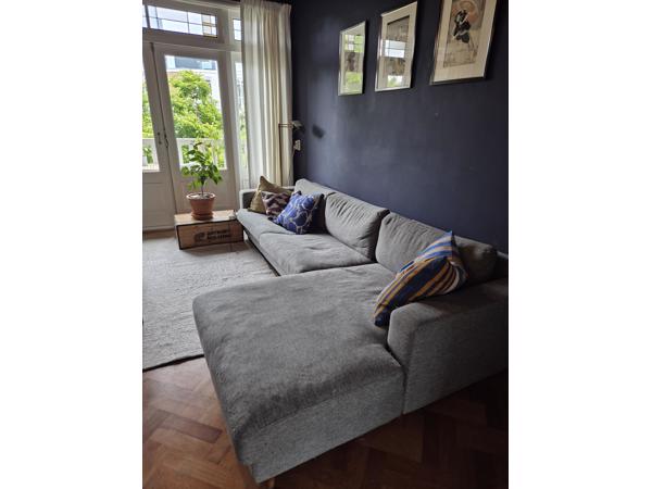 Grijze fijne bank die al heel wat zituurtjes heeft gehad maar best nog een tijdje mee kan. Kan in twee delen uit elkaar. Drie meter breed, Chaise longe gedeelte is 160.