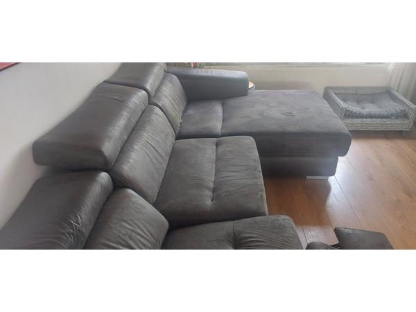 Bank is gebruikt maar zit nog prima. Aan de ene kant een elektrische voetensteun die je uit kunt klappen, aan de andere kant een hocker, zodat je met meerdere personen languit op de bank kan liggen. Hocker is 1.50 meter, rest van de bank 90 cm. diep. Zelf op komen halen.