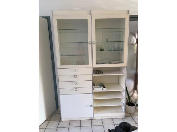 Mooie en functionele buffetkast, ideaal voor het opbergen van servies, bestek en andere keukenbenodigdheden. De kast beschikt over twee vitrinedelen met glazen deuren, vier handige lades en een open gedeelte met meerdere planken.