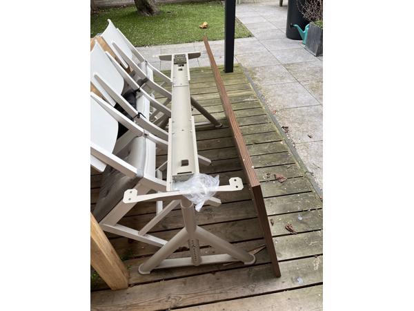 Bruin bureaublad met hout-look van Ikea, met stevig onderstel en kabel-beheer. Het onderstel is in hoogte aan te passen middels een stel bouten (dus niet met een zwengel of electrisch). 160x80cm