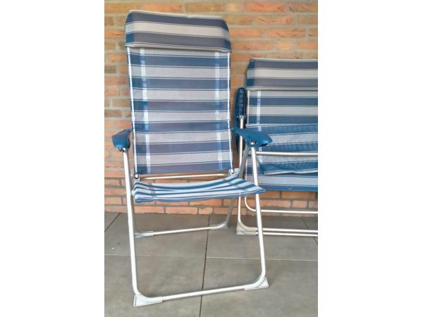 lichtgewicht campingstoel, 2 stuks. Incl hoofdsteun, mechanisch geheel OK. Zitting van rechterstoel is van eerdere rugleuning en omgeslagen, kan afgeknipt. Kunststof armleuning.Advertentienummer: 237071