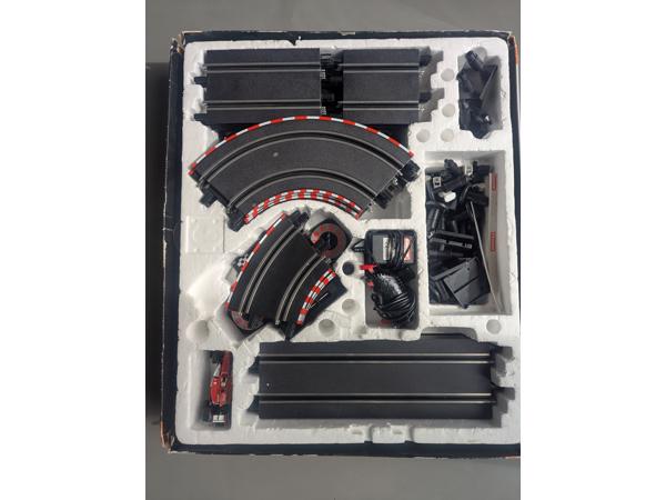 Voor de handige maker of ter uitbreiding van een bestaande baan, een vrij complete Carrera racebaan. Met veel baan-delen, twee race-auto's en een reserve-onderdelen. Baan werkt waarschijnlijk niet meer vanwege kapotte draad (zie foto's).