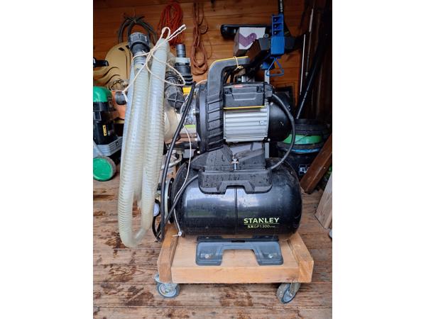 Centrifugaalpomp Stanley SXGP1300xfbe. 19mm aansluiting. Pompt ruim 4000 liter per uur. 3 tot 5 bar druk. Met 40 meter slang 19mm. Op het eind een 3 weg verdeling voor 3 tuinslangen.