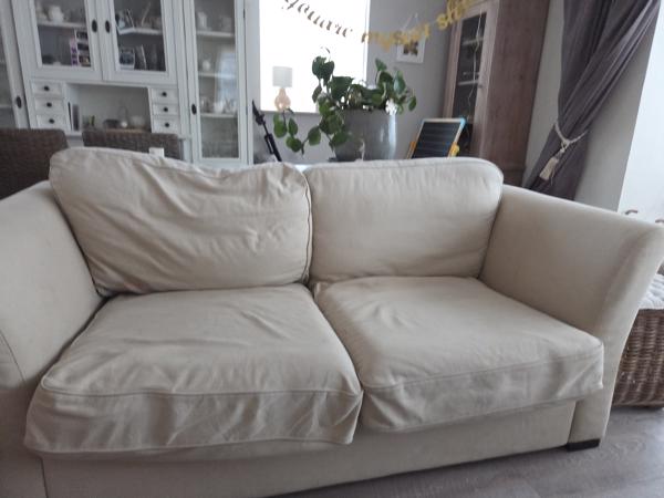 Fijne 2,5-zits bank in een lichte, neutrale kleur. Zit nog heerlijk met stevige zirkussens. Alleen 1 kant rugleuning is wat zachter. Heeft wat gebruikssporen, maar kan zeker nog een ronde met een dekentje erover heen.