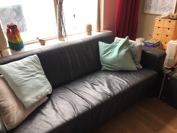 Comfortabele echt leren zwarte bank, 25 jaar erg veel plezier van gehad. Kan veel hebben, makkelijk in onderhoud.