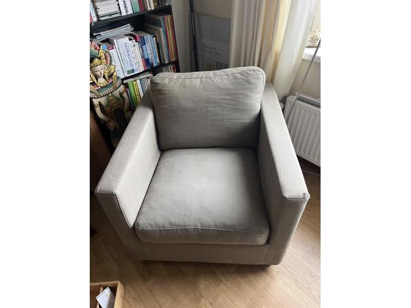 Grijze comfortabele fauteuil met kleine gebruikerssporen. Rond de 85 cm breed en 95 cm diep.