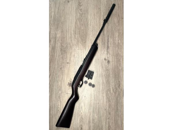 Aangeboden Crosman 1077 wood luchtbuks met een dempertje en magazijntjes.