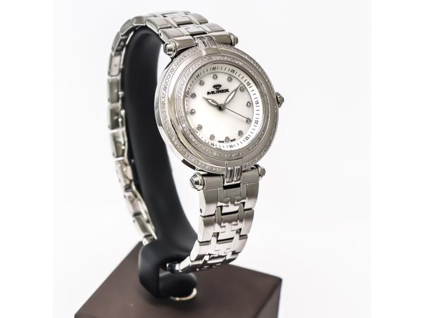 Wijzerplaat: Wit parelmoer. Zilverkleurige wijzers gevuld met lume en echte diamanten indexen. Ronde kast.
