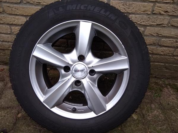 Set DEZENT-F velgen met Michelin banden. De voorbanden hebben nog 1-2mm profiel en de achterbanden nog 2-3mm(zie fotos). Velgen zelf zijn qua uiterlijk in redelijke staat maar daar is de prijs ook na. De velgdoppen zijn wel aan vervanging toe maar deze kan je er zo uit klikken. De velgen zijn wel recht, dus geen trillingen in het stuur!