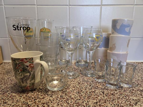 Diverse glazen, bierglazen shotglaasjes, mok en koffiekopjes. Alleen allemaal tegelijk op te halen.