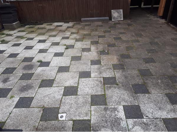 En nog een 2e partij (foto 2): bruikbare betonstenen/tegels voor aanleggen van terras of verharde paden. Ongeveer 100 stuks van 40 x 40 cm, en ong. 100 stuks 20 x 20 cm. Tot eind april beschikbaar.