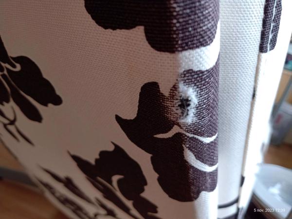 Een Ikea klassieker; zit uitstekend. Zitting is verkleurd, met kringen Rugleuning: witte achtergrond heeft bruine sluier Bovenzijde deels verkleurd. 1 slijtplek aan het frame - 1 cm.