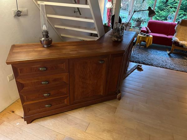 dressoir bestaat uit twee delen, 120 en 130 cm, onder een hoek van 135 graden. dressoir is gedeeltelijk gedemonteerd in verband met verhuizing