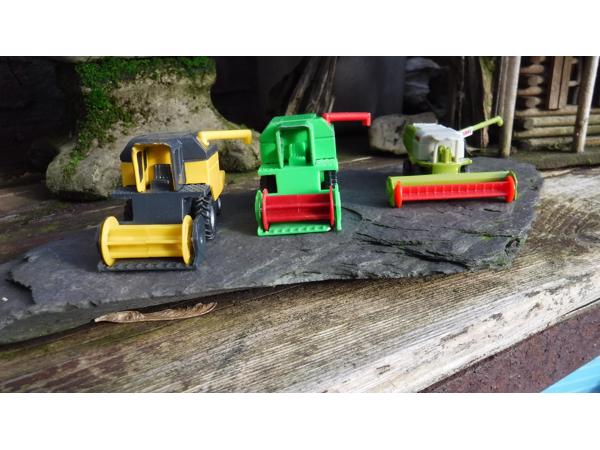 bij alle drie:beweegbare maairol / balk. beweegbare afvulpijp. De donker groene is bespeeld deze heeft lakschade.de andere twee zijn in nieuw staat.