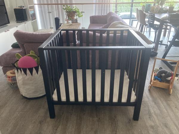 Onze zoon is één geworden, en wij hebben onze box niet meer nodig. Het is een simpele, stevige zwarte box, met een matrasje. De box zelf heeft gebruikssporen, maar kan nog prima een ronde mee.